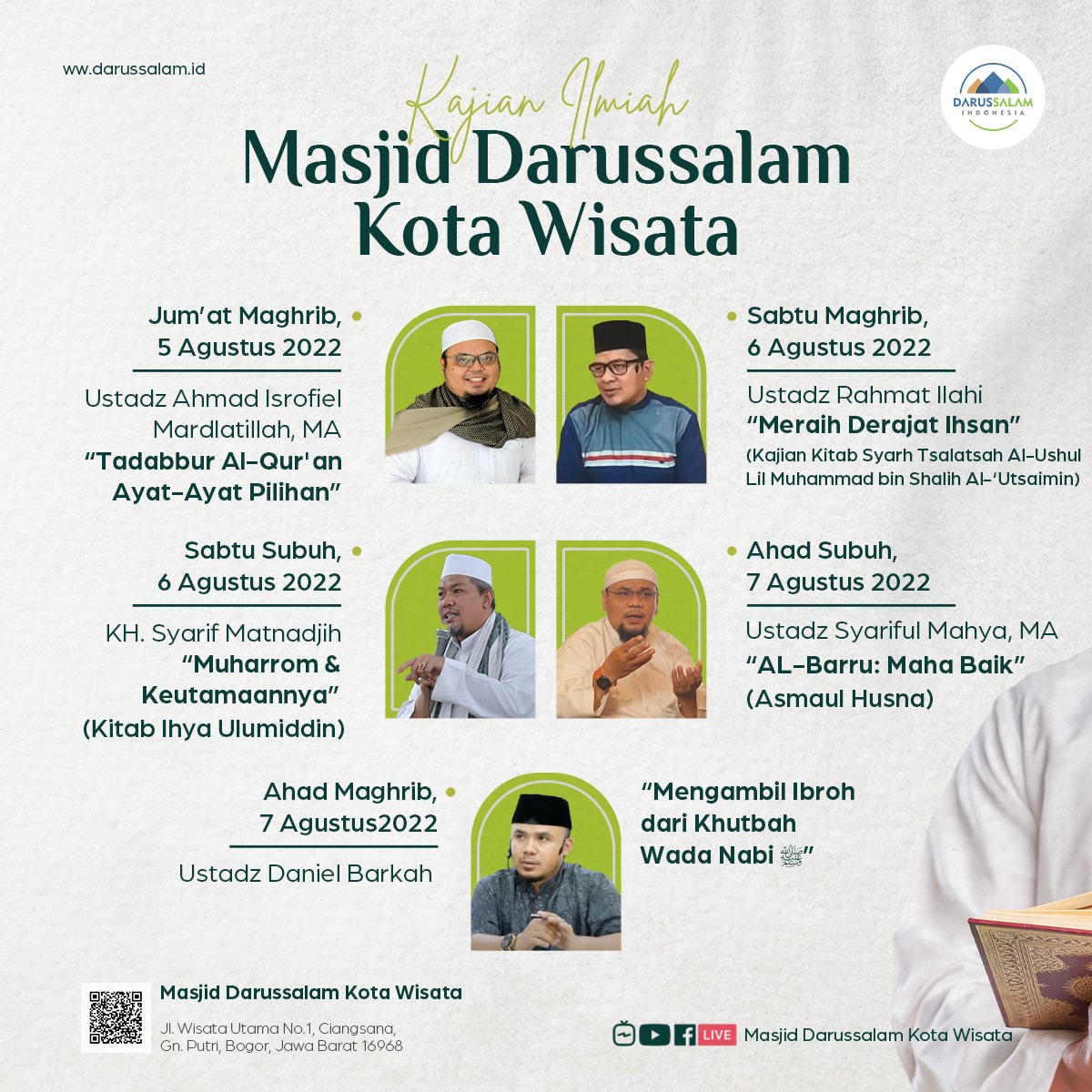 KAJIAN ILMIAH 🕌 MASJID DARUSSALAM KOTA WISATA 🗓 5-7 Agustus 2022/7-9 Muharram 1444 H