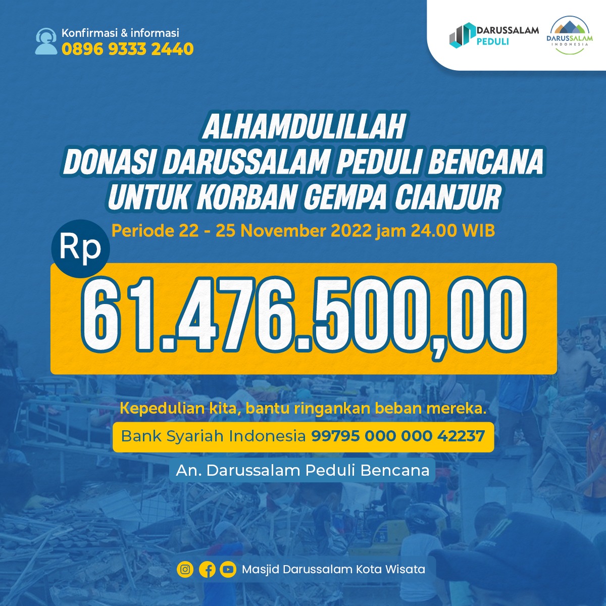 Alhamdulillah Donasi Darussalam Peduli Bencana Untuk Korban Gempa Cianjur Periode 22-25 November 2022 Jam 24.00 WIB Rp.61.476.500,00