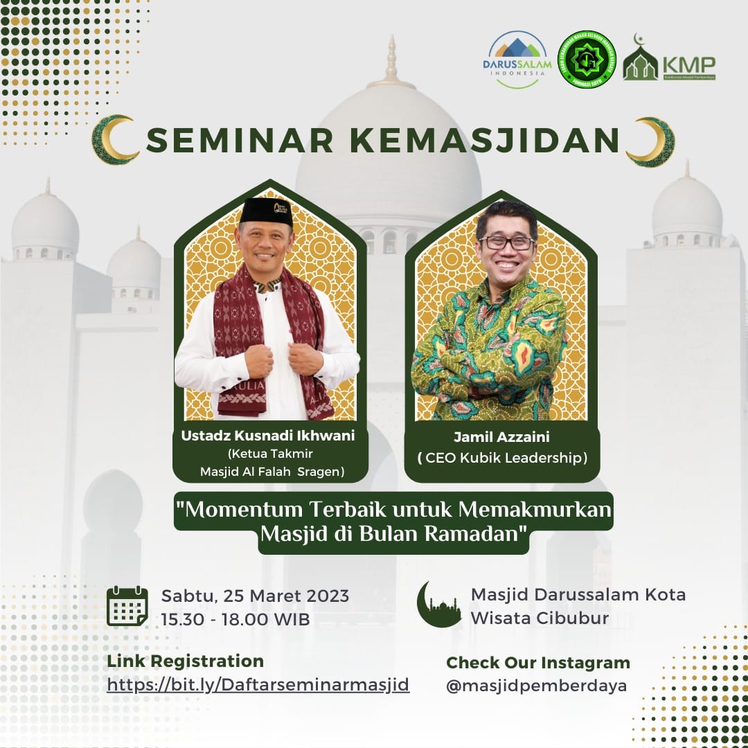 ๐ SEMINAR KEMASJIDAN ๐ Bersama Kolaborasi Masjid Pemberdaya Assalamu'alaikum warahmatullahi wabarakatuh. Kami dari Pengurus Kolaborasi Masjid Pemberdaya (KMP) - Dompet Dhuafa mengajak para Pengurus DKM/Tamir Masjid dan jamaah untuk hadir dalam...