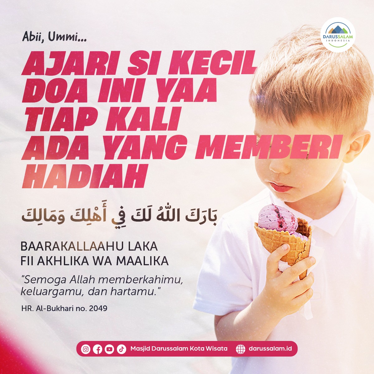 Yuk kita ajarkan adab terbaik seorang muslim kepada anak-anak kita. Semoga menjadi pahala jariyah. Abii, Ummi... Ajari si kecil, doa ini yaa tiap kali ada yang memberi hadiah. بَارَكَ اللهُ لَكَ فِي أَهْلِكَ وَمَالِكَ BAARAKA...
