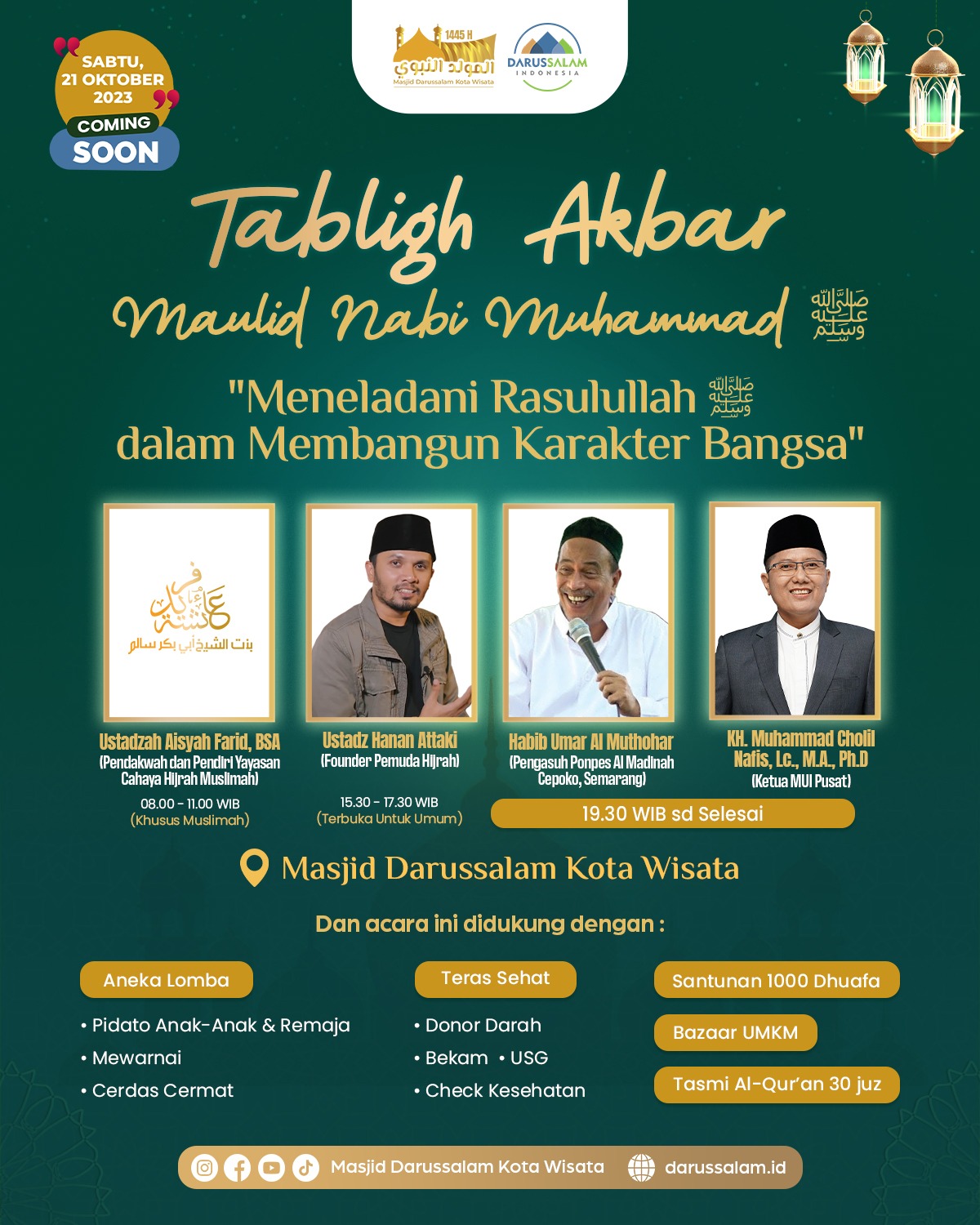 📋 Undangan Tabligh AkbarSPESIAL MAULID NABI MUHAMMAD ﷺ📜 “ Meneladani Rasulullah ﷺ Dalam Membangun Karakter Bangsa”Pemateri:SESI 1🎙 Ustadzah Aisyah Farid BSA (Alumni Daruzzahra, Tarim, Yaman) - Khusus Musli...