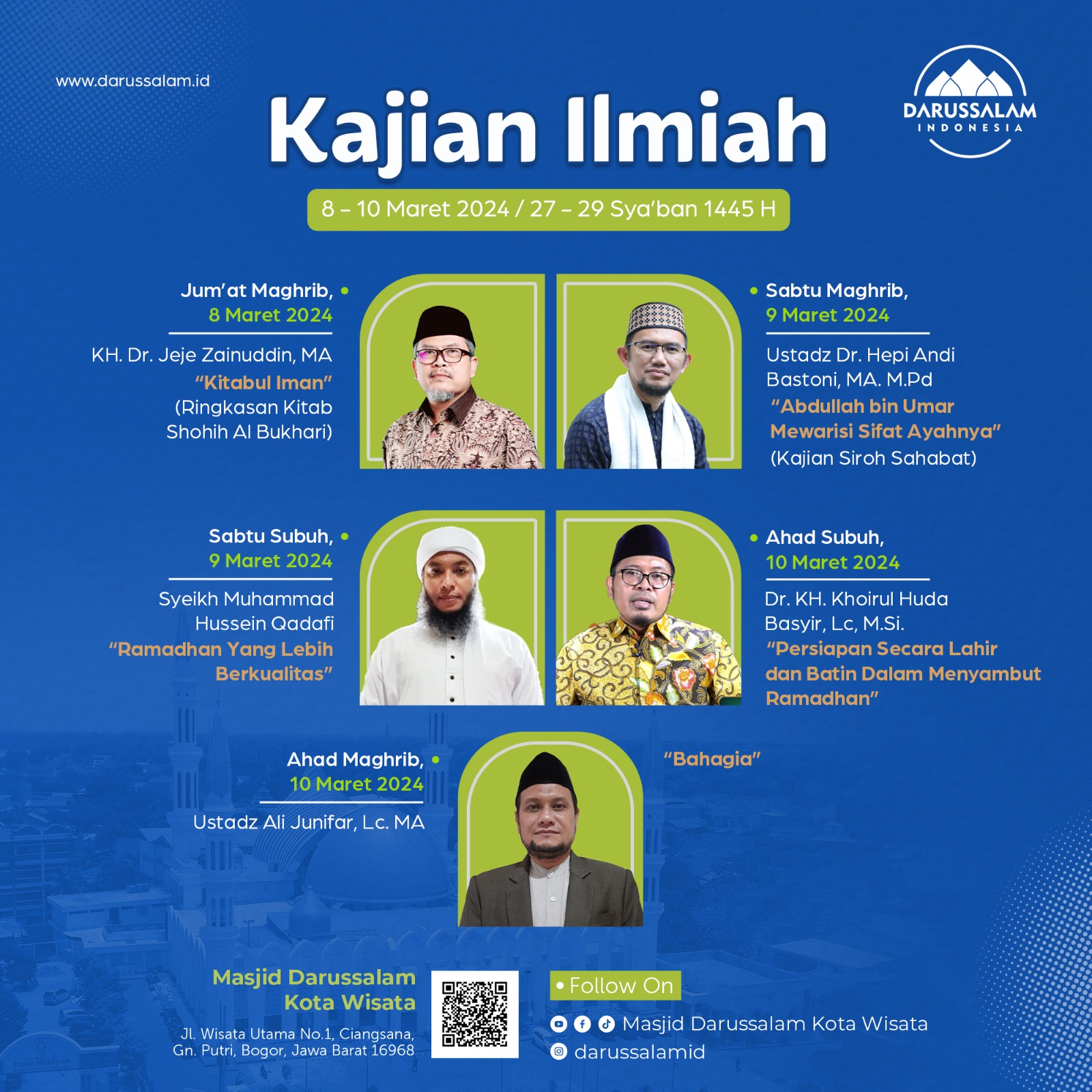 Kajian Ilmiah Masjid Darussalam Kota Wisata, 8-10 Maret 2024/27-29 Sya'ban 1445 H Kajian Jum’at Maghrib, 8 Maret 2024/27 Sya'ban 1445 H👤 KH. Dr. Jeje Zainuddin,...