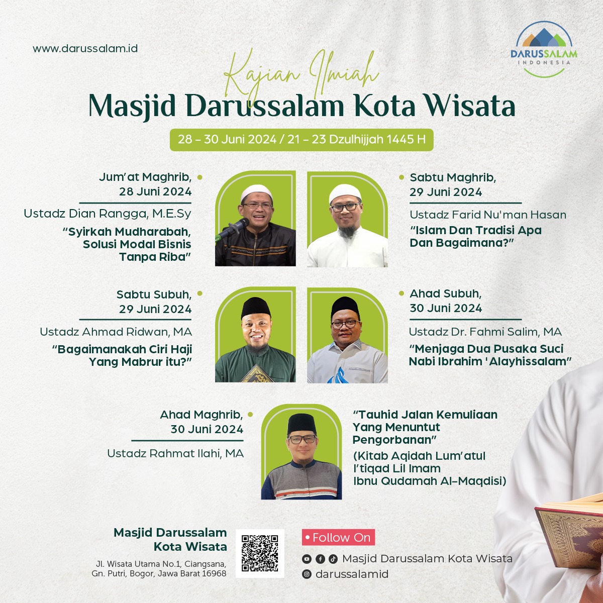 KAJIAN ILMIAH MASJID DARUSSALAM KOTA WISATA 🗓 28-30 Juni 2024/21-23 Dzulhijjah 1445 H 🎙Kajian Jum’at Maghrib🗓 28 Ju...