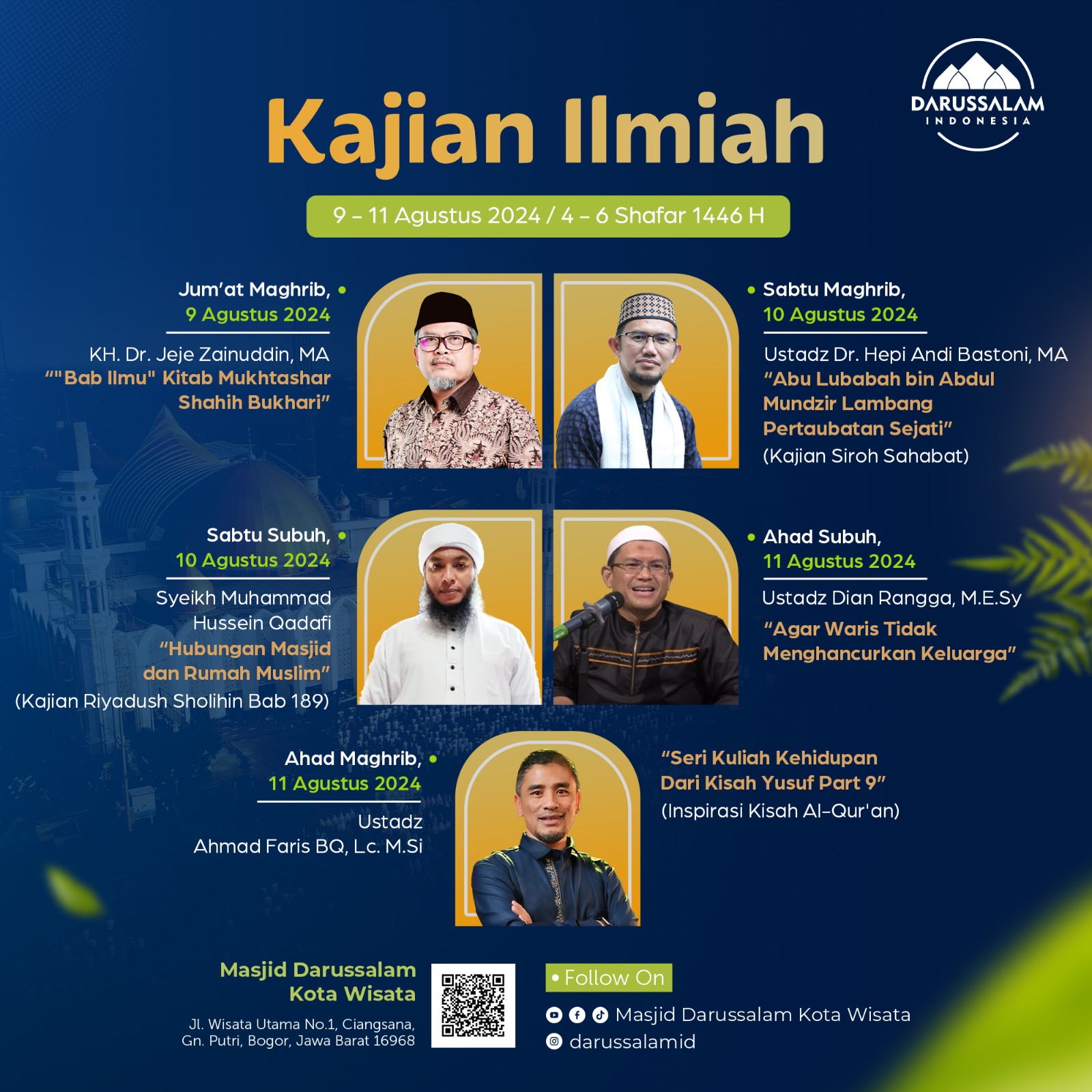 KAJIAN ILMIAH MASJID DARUSSALAM KOTA WISATA 🗓 9-11 Agustus 2024/4-6 Shafar 1446 H 🎙Kajian Jum’at Maghrib, 9 Agustus 202...