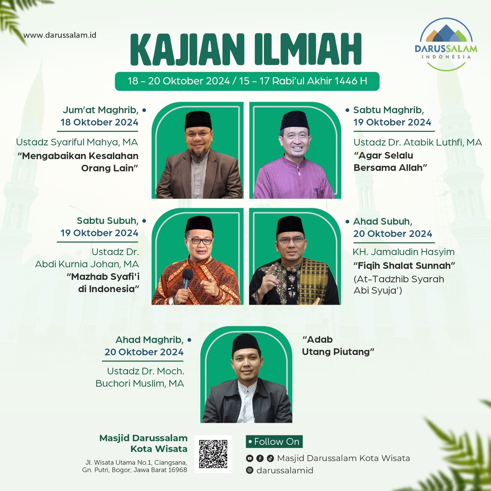 KAJIAN ILMIAH MASJID DARUSSALAM KOTA WISATA 🗓 18-20 Oktober 2024/15-17 Rabi'ul Akhir 1446 H 🎙 Jum’at Maghrib🗓 18 Ok...