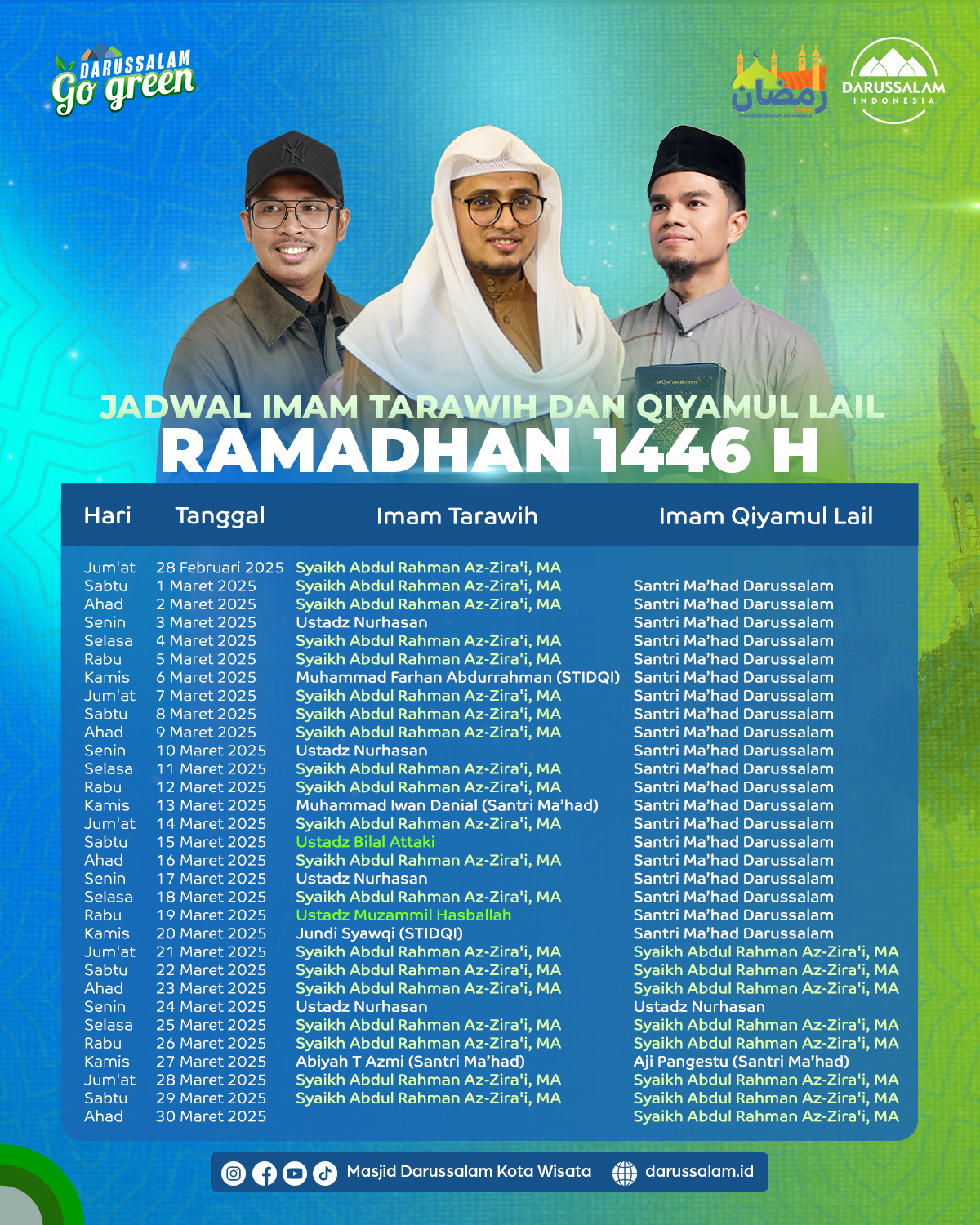 Jadwal Imam Tarawih dan Qiyamullail Ramadhan 1446 H Masjid Darussalam Kota Wisata. 🌐 Live StreamingTikTok : ...