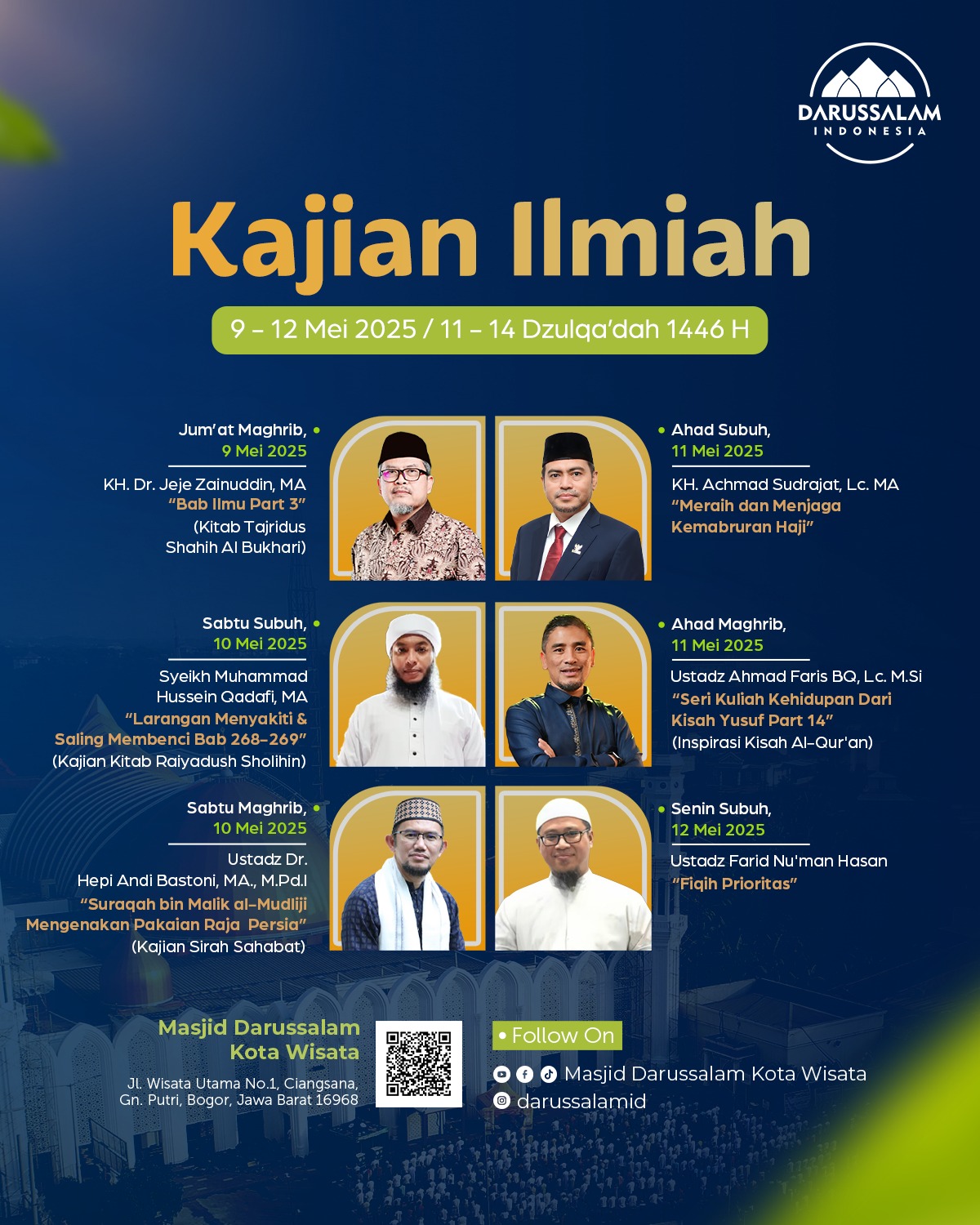 KAJIAN ILMIAH🕌 MASJID DARUSSALAM KOTA WISATA 🗓 9-12 Mei 2025/11-14 Dzulqa'dah 1446 H 🎙 Jum’at Maghrib🗓 9 Mei 20...
