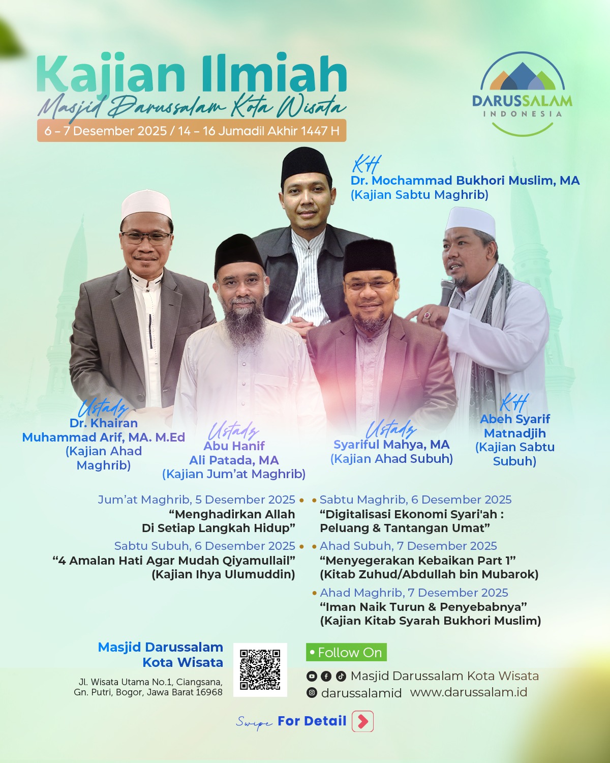 KAJIAN ILMIAH🕌 MASJID DARUSSALAM KOTA WISATA 🗓 5-7 Desember 2025/14-16 Jumadil Akhir 1447 H 🎙 Jum’at Maghrib🗓 5...