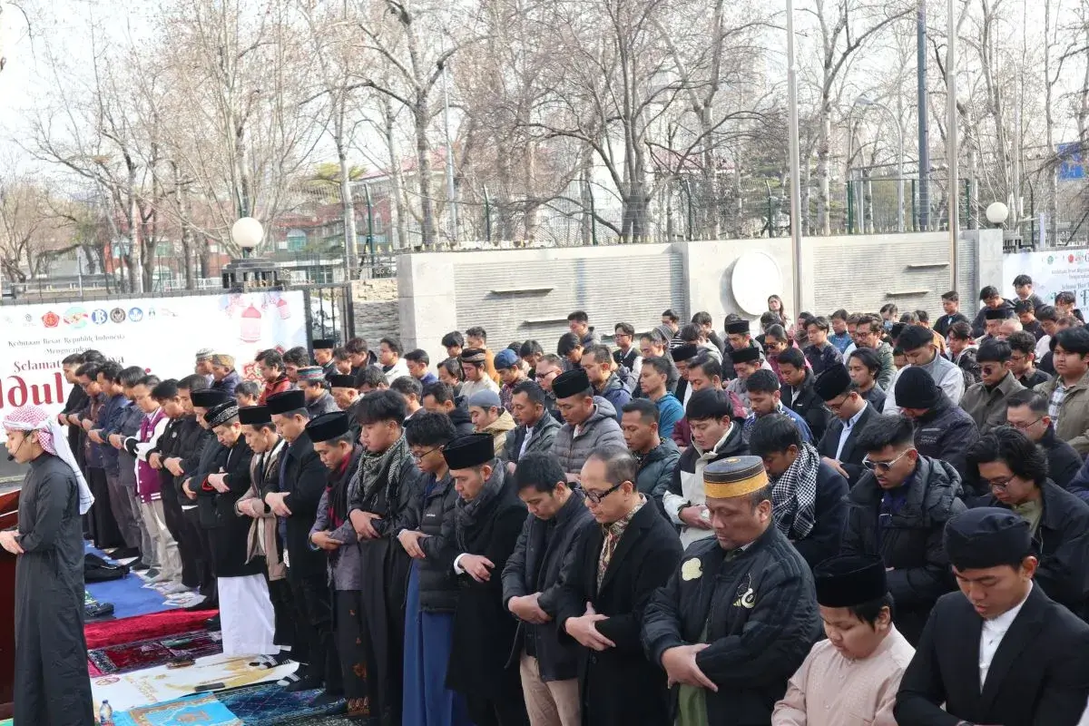 Sekitar 400 orang warga negara Indonesia (WNI) dari Beijing dan sekitarnya melaksanakan salat Idul Fitri 1447 Hijriah di halaman Kedutaan Besar Republik Indonesia (KBRI) Beijing pada Sabtu (21 Maret 2026). ...
