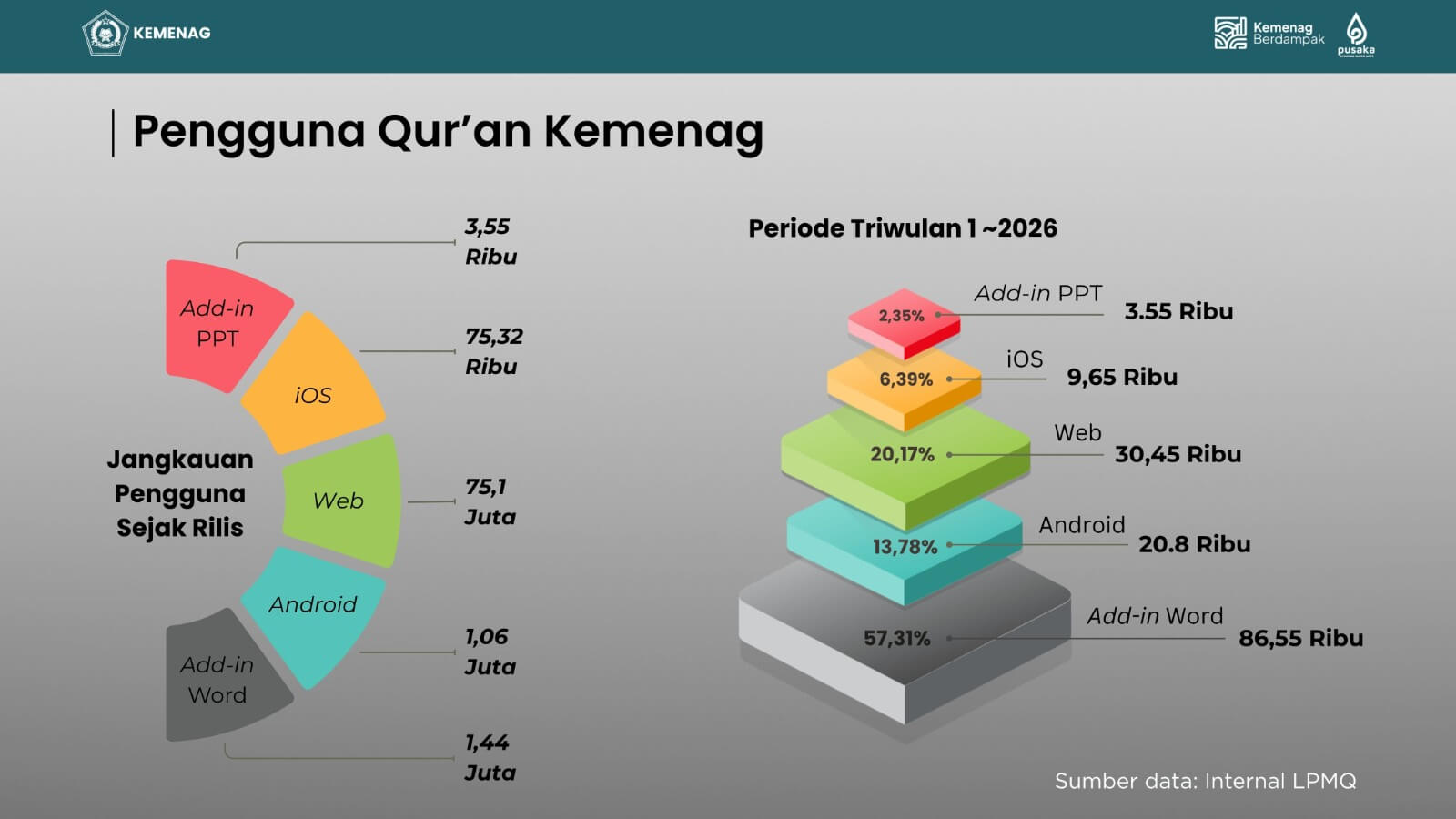 Kehadiran layanan digital Qur’an Kemenag banyak diakses masyarakat. Data statistik Lajnah Pentashihan Mushaf Al-Qur'an (LPMQ) per April 2026, total akumulasi jangkauan pengguna Qur’an Kemenag dari seluruh platform telah menem...