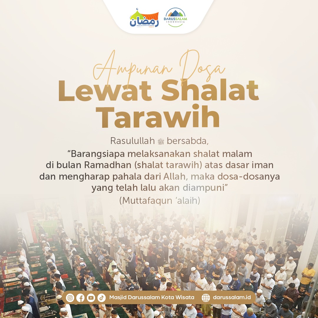 “Barangsiapa melaksanakan shalat malam di bulan Ramadhan (shalat tarawih) atas dasar iman dan mengharap pahala dari Allah, maka dosa-dosanya yang telah lalu akan diampuni”