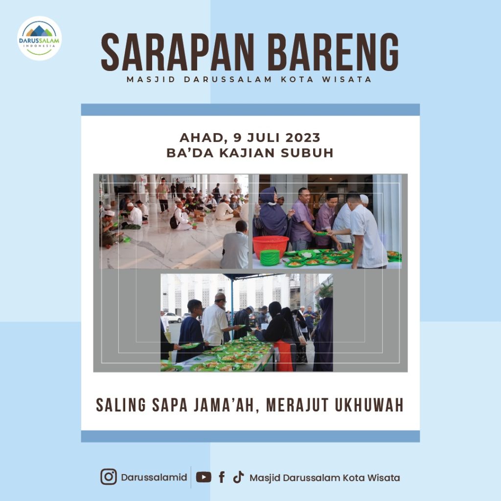 Sarapan bareng jamaah dilaksanakan setiap Ahad Subuh. Jamaah boleh menikmati hidangan yang telah disediakan tanpa pungutan biaya.