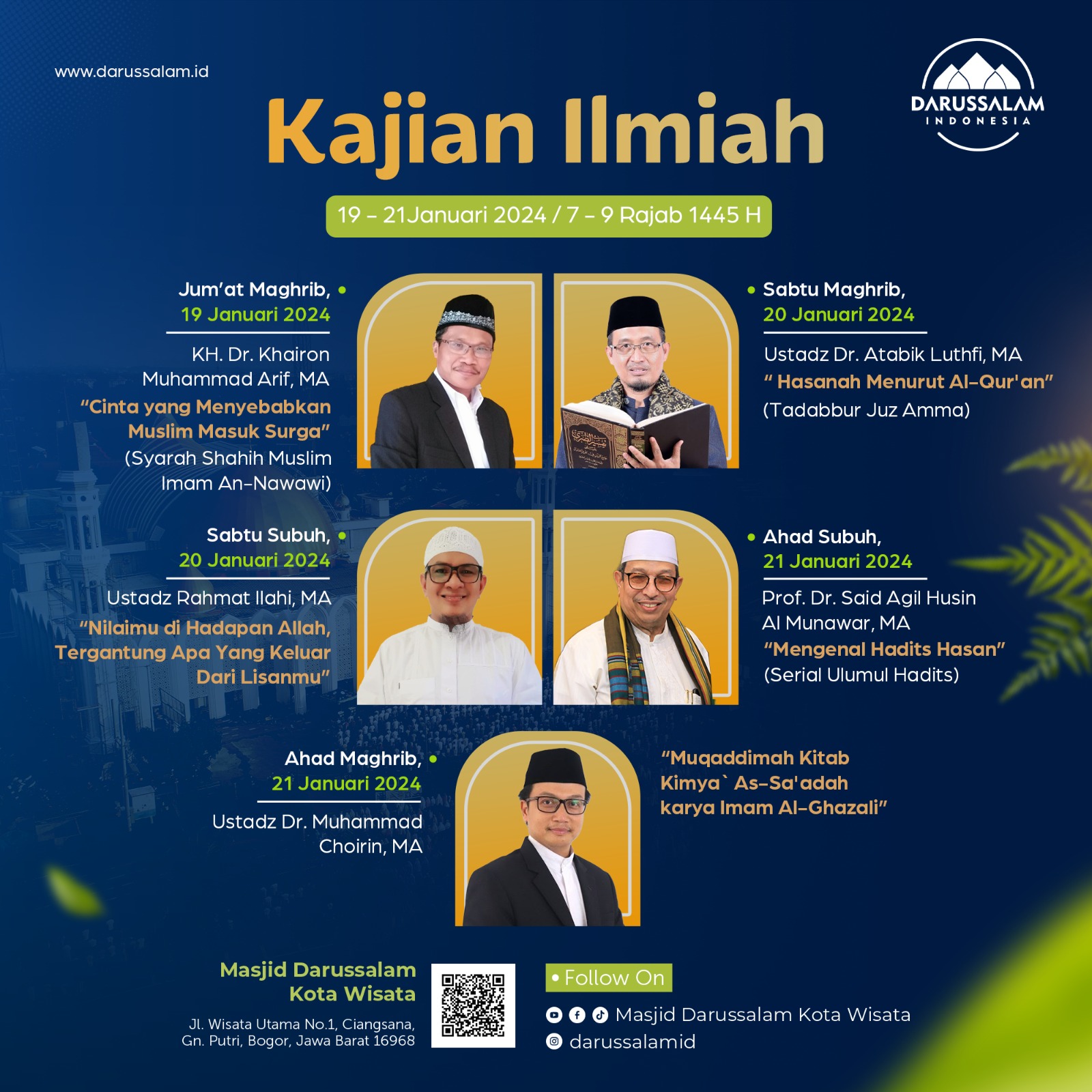 KAJIAN ILMIAH MASJID DARUSSALAM KOTA WISATA 🗓 19-21 Januari 2024/7-9 Rajab 1445 H 🎙 Jum’at Maghrib🗓 19 Januari 2024...