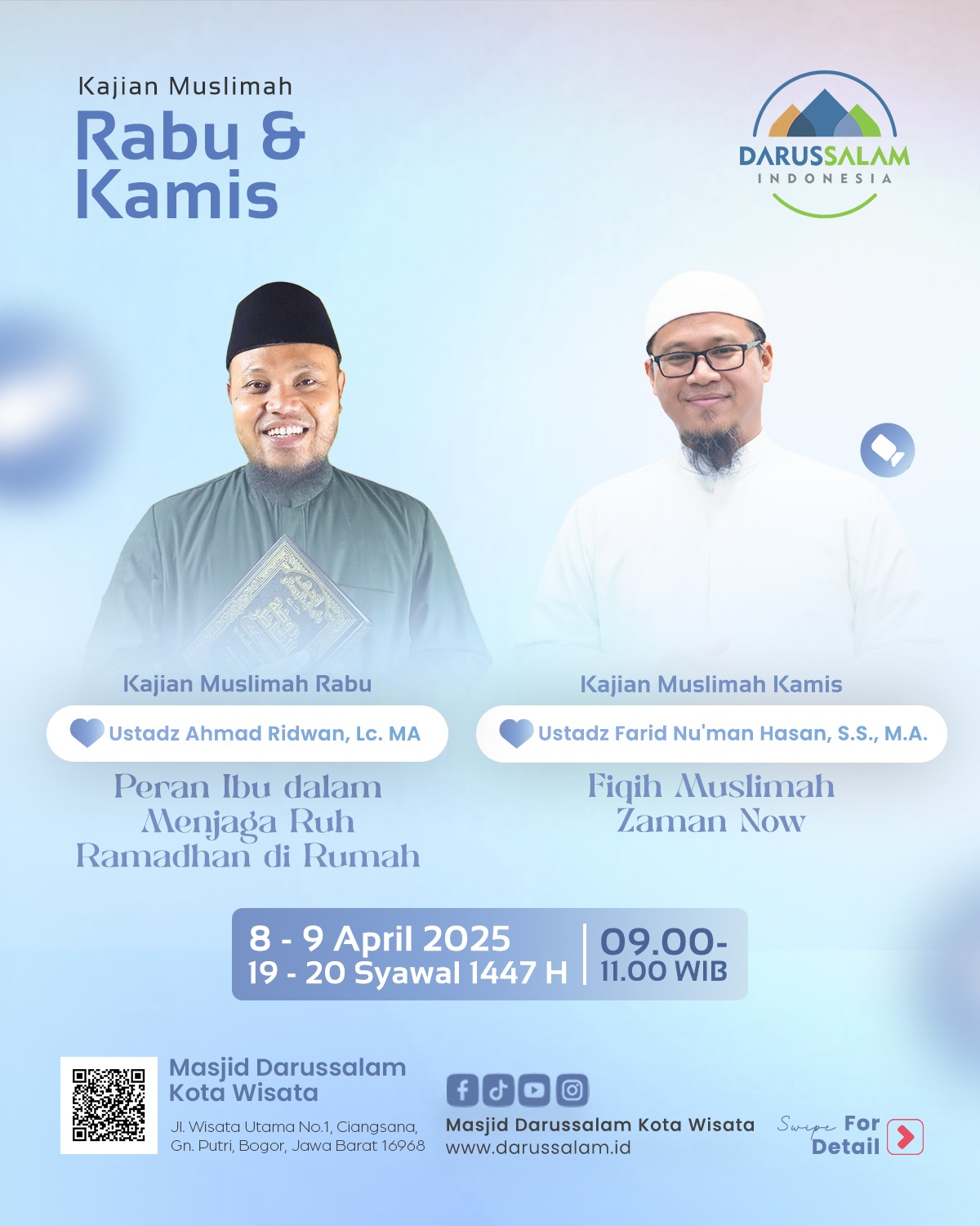 KAJIAN ILMIAH MASJID DARUSSALAM KOTA WISATA, 9-11 Februari 2024/28 Rajab-1 Sya'ban 1445 H Jum’at Maghrib, 9 Februari 2024/28 Rajab 1445 H ...