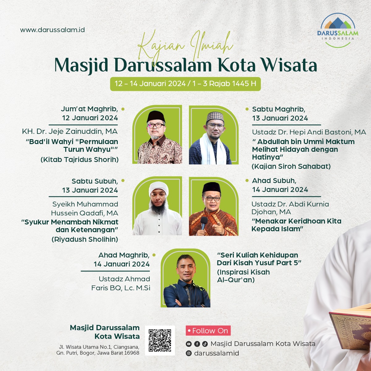 KAJIAN ILMIAH MASJID DARUSSALAM KOTA WISATA 12-14 Januari 2024 / 1-3 Rajab 1445 H Jum’at Maghrib, 12 Januari 2024 / 1 R...